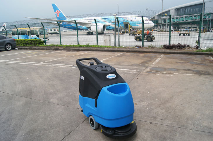 首先对于手推式洗地机的设计来说,这种造型设计轻便灵活,并且操作比较简单,能够自如的在各种狭小空间清洁,再者它的工作效率也是非常高的,远远超过了人类手工拿着拖把拖地的速度,比如一个2000平米的机场,如果靠手工清理,可能会需要6个小时才可以搞定,而一台手推式洗地机只需1个小时就能完成清洁工作了。